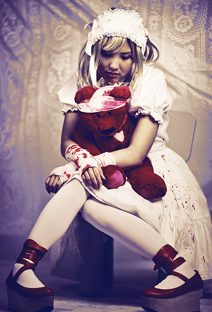 El nombre de Guro Lolita procede de “Gore Lolita“, y es tal cual lo que podéis imaginar: un estilo de ropa y maquillaje que imita a personas heridas.
